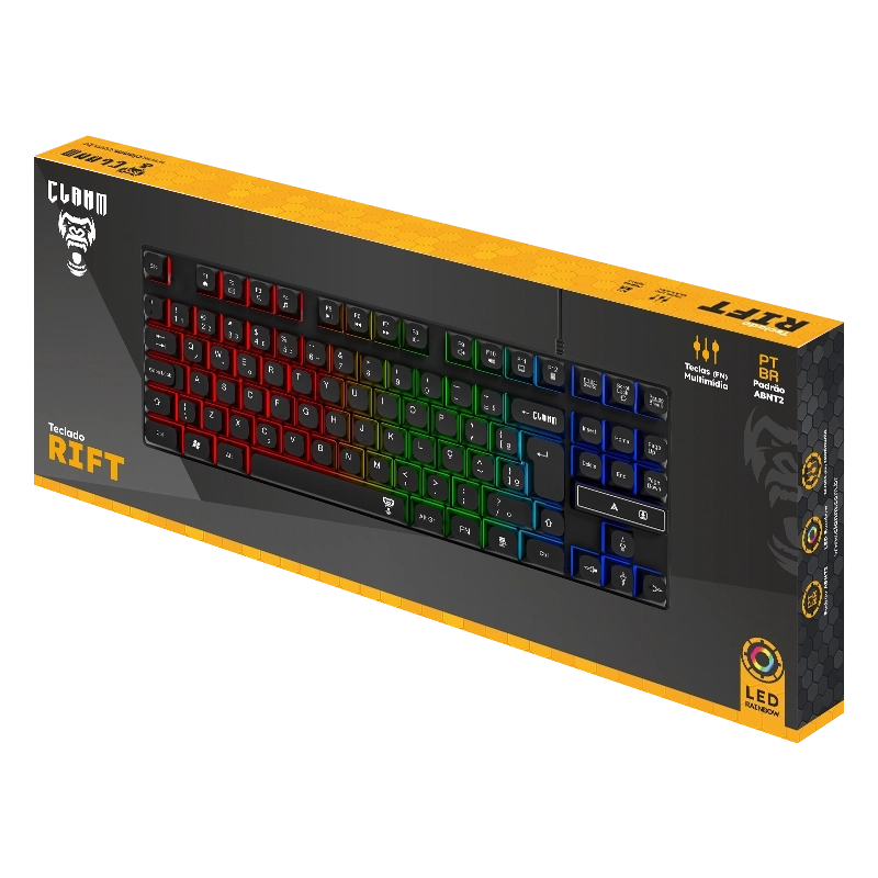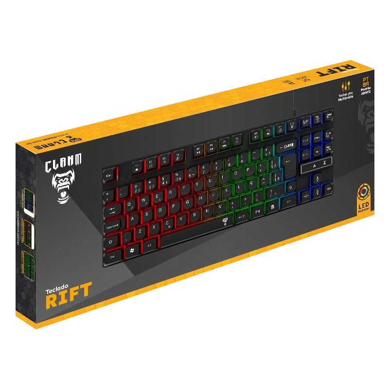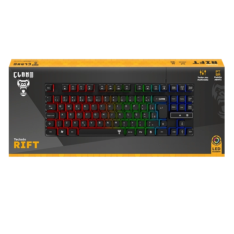 O teclado gamer 80% Rift da Clanm oferece o equilíbrio perfeito entre tamanho e desempenho. Com layout compacto que elimina o teclado numérico, é ideal para setups com espaço reduzido, sem abrir mão das teclas essenciais. Perfeito para quem busca mais mobilidade, ergonomia e estilo na mesa.